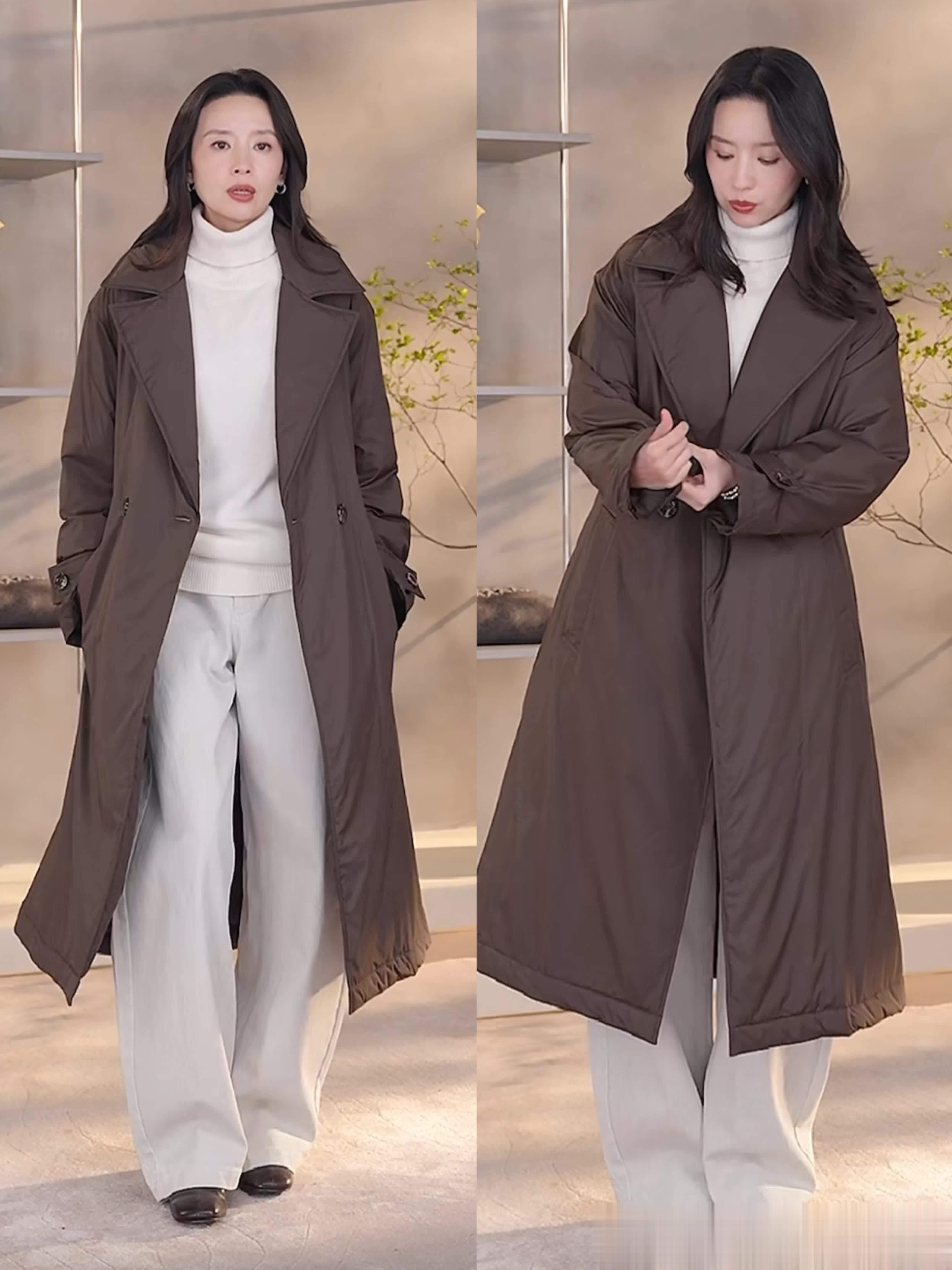 就说那件风衣式羽绒服,简直是为秋冬量身定做的“万能款”。经典的风衣轮廓,肩线利落不夸张,长度到膝盖上下,不管是小个子还是高个子都能驾驭。最妙的是腰带设计,系上是慵懒随性的松弛感,解开又能藏住腰腹的小肉肉,上周降温我仿着穿了件类似款,朋友盯着看了半天:“你这羽绒服看着不笨重啊,还挺显气质。” 奶白色温柔得像秋日阳光,深棕色自带复古滤镜,两种颜色都是不挑肤色的“安全牌”,搭牛仔裤是休闲风,配长裙又能穿出知性味,哪怕明年拿出来穿,照样不过时。